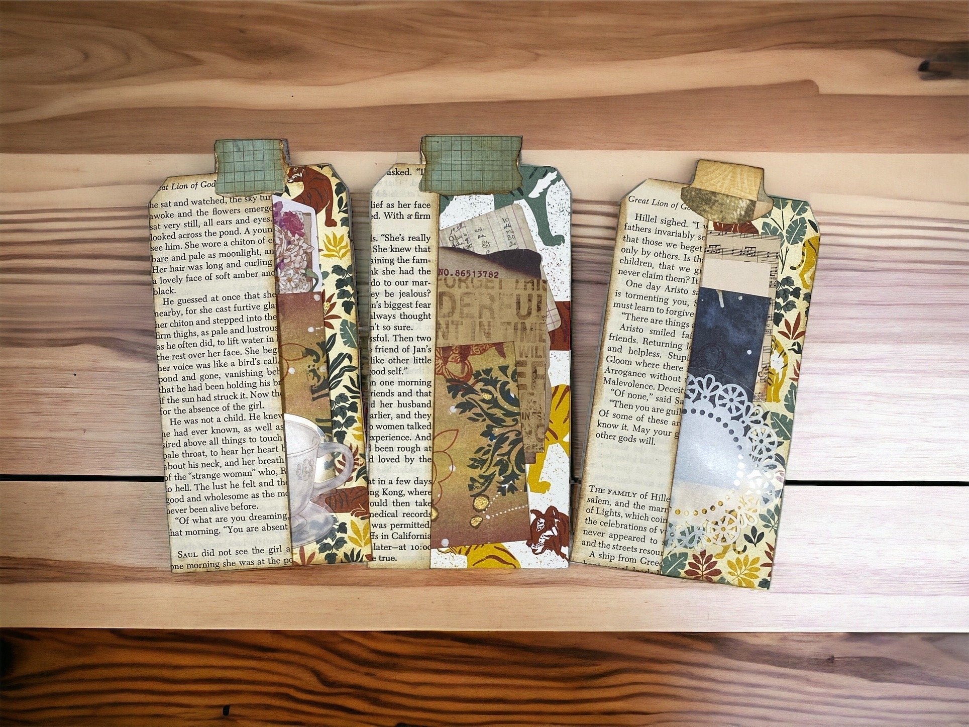 Add a touch of wild adventure to your journal with this set of three handmade junk journal tags featuring lions and tigers. Each tag is crafted from book pages with pockets and filled with unique ephemera for layering, journaling, or decorating.