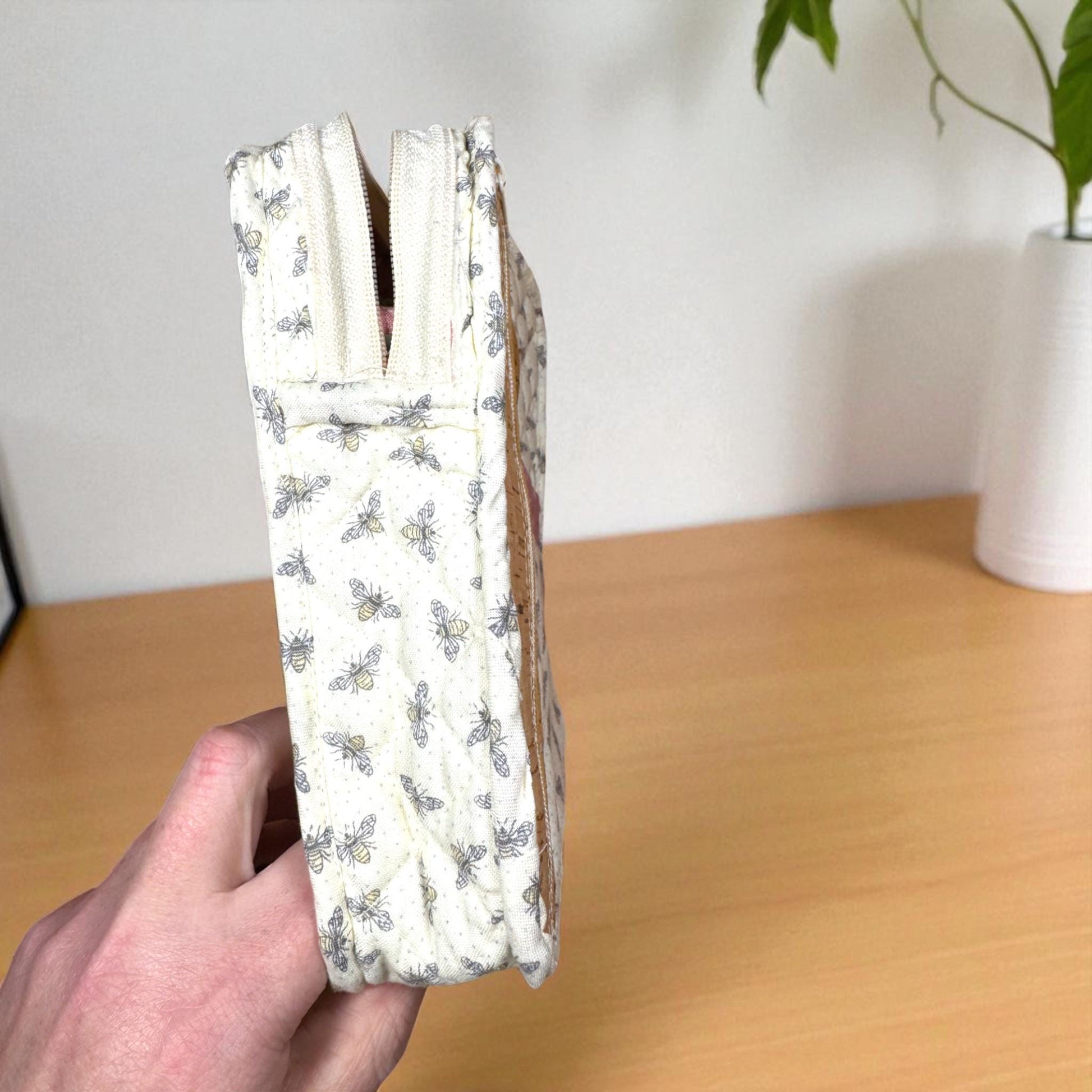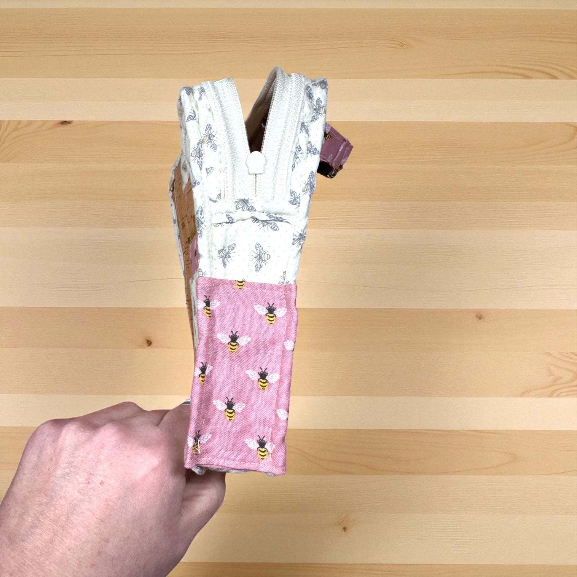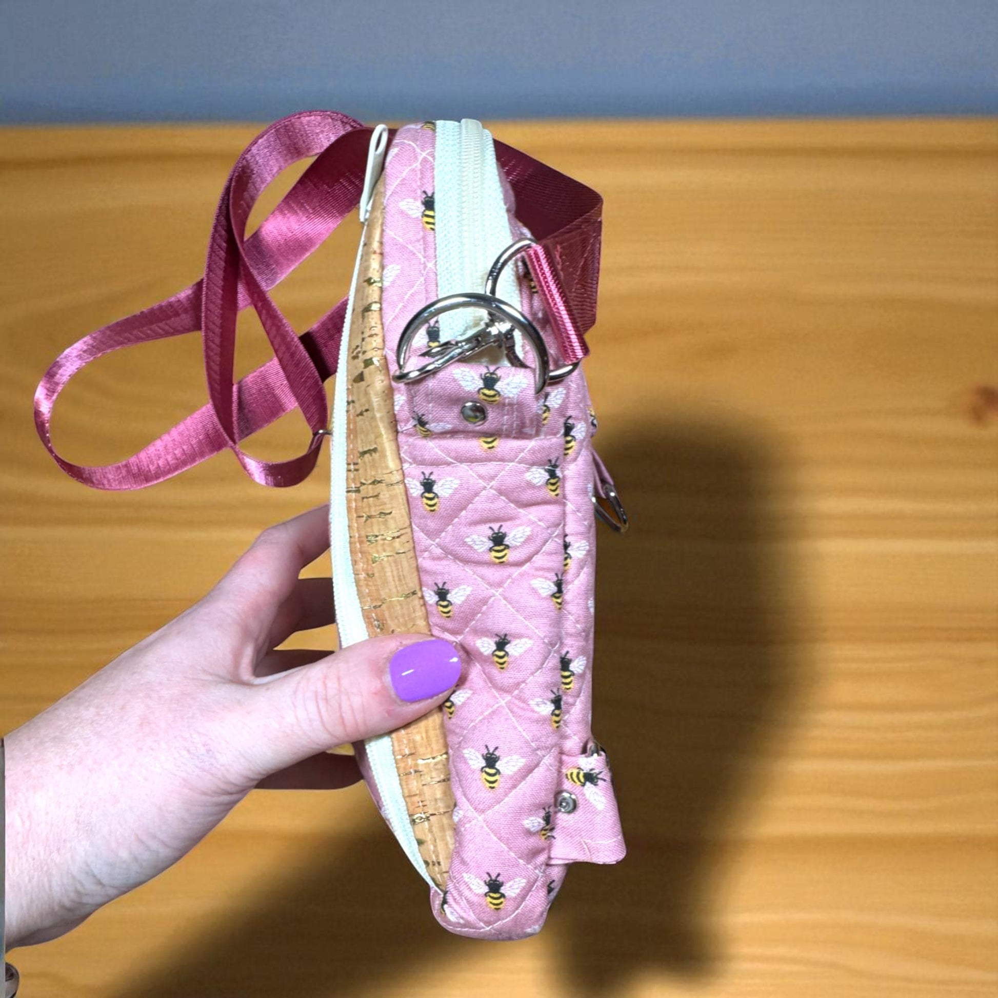 This is a Maker's Sample of the Busy Bee Bag, handcrafted to refine the design and construction process - making it a unique and one-of-a-kind piece. Created in quilted pink cotton with a charming bee print, this convertible bag combines playful style with practical function. Measuring 6" x 8" x 1", it's the perfect size for daily use, errands, or travel.