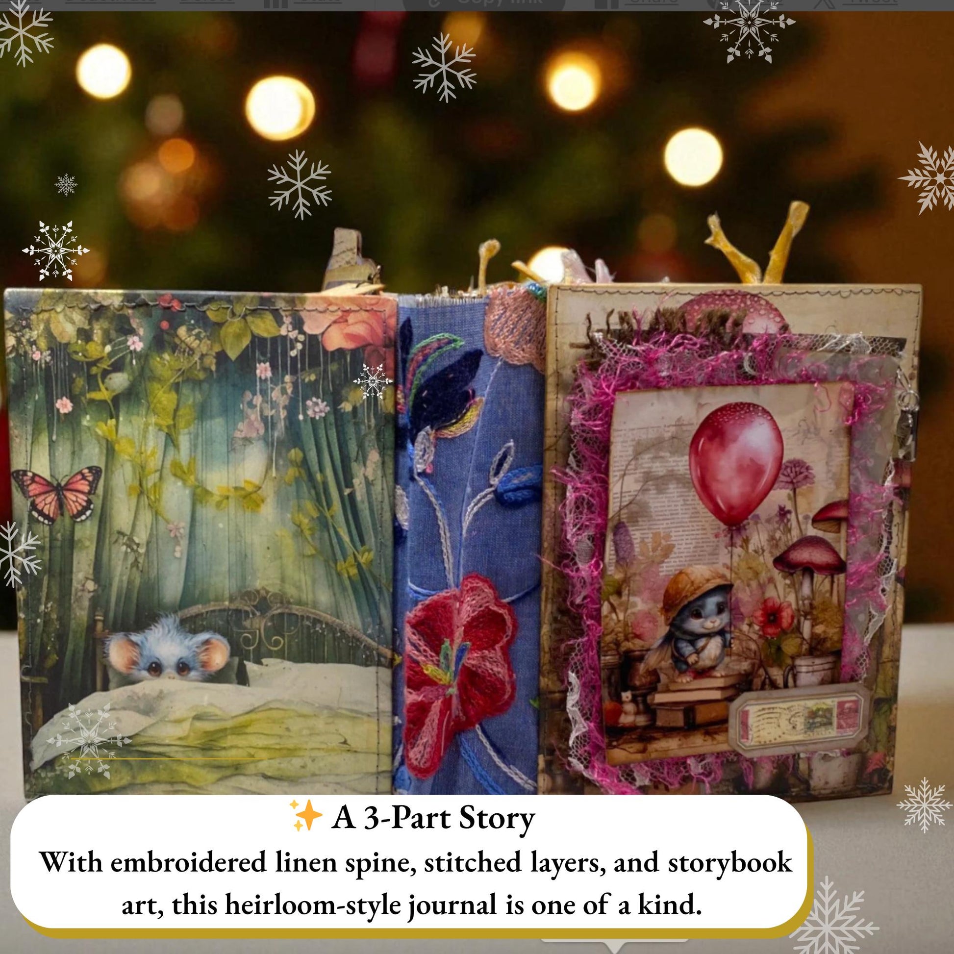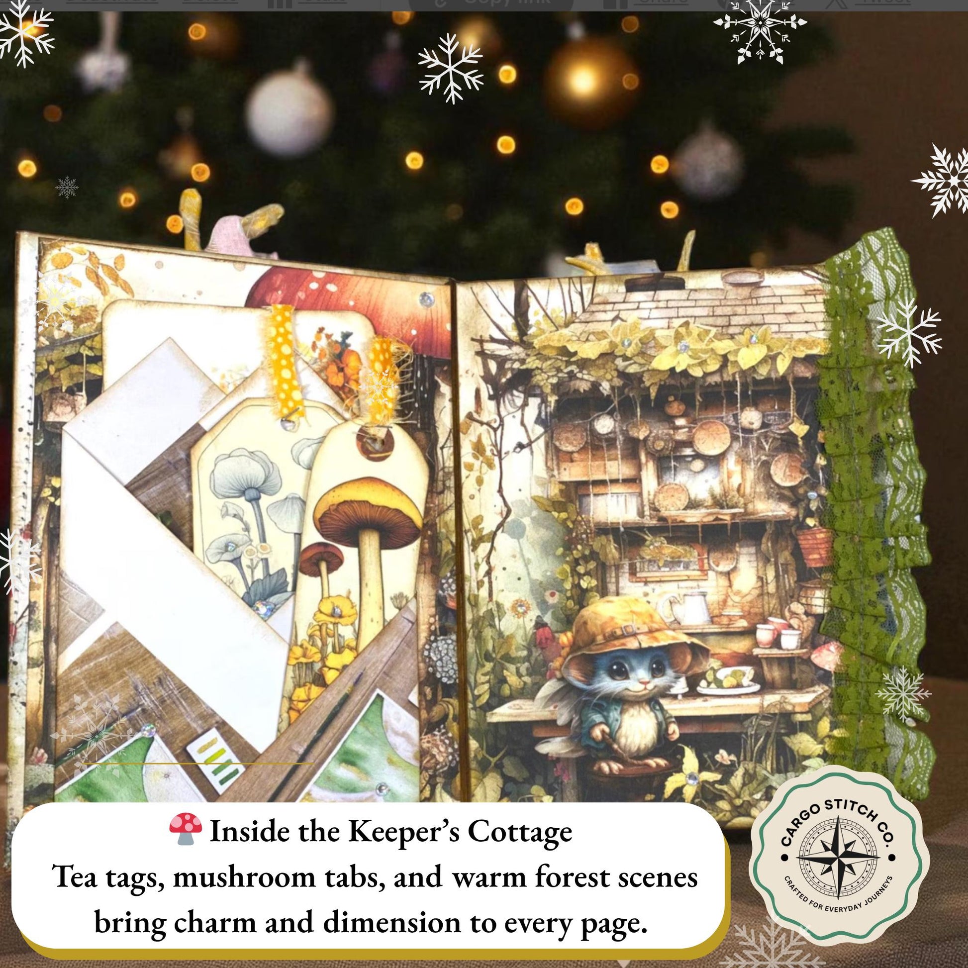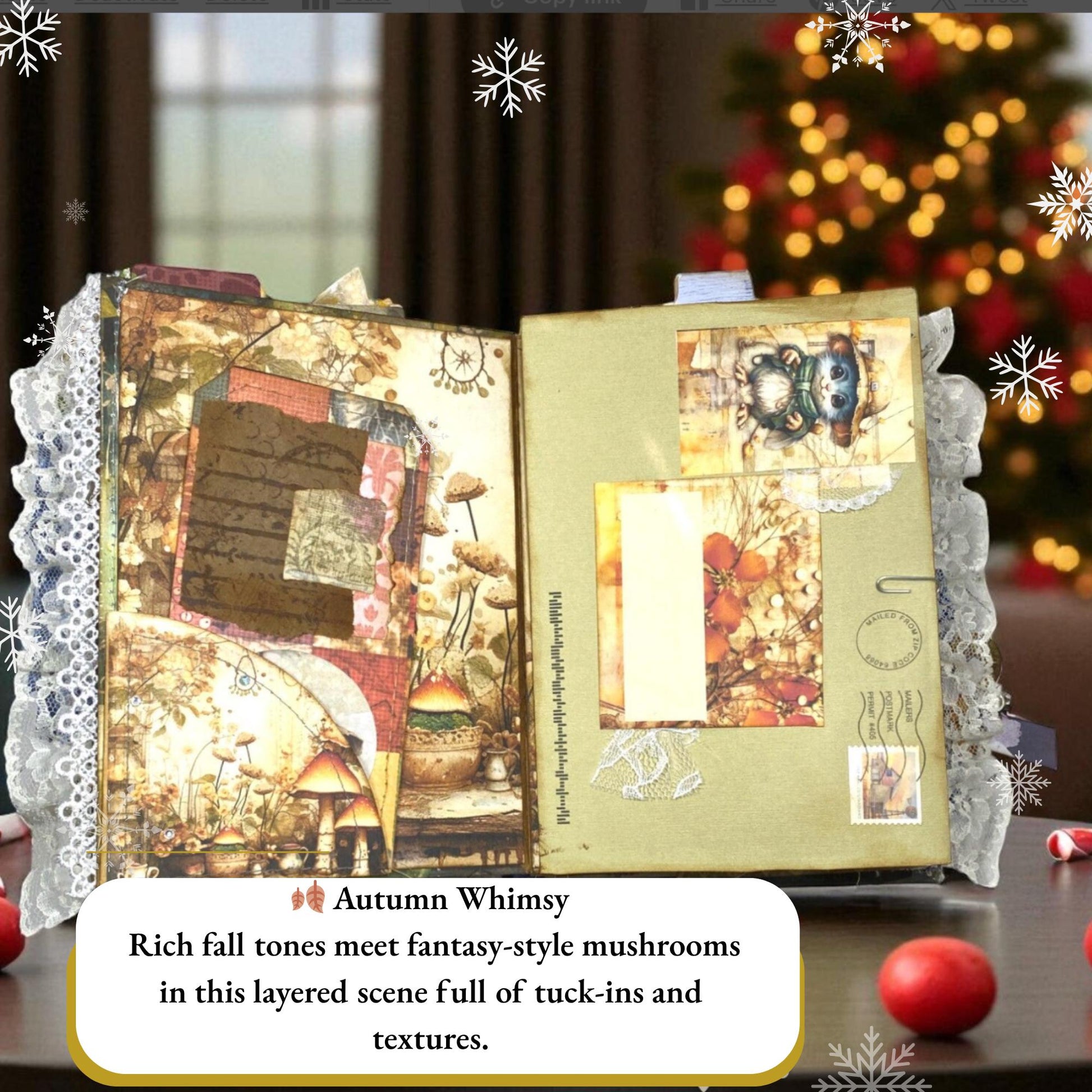 This handmade expandable envelope junk journal is part of the Whimsical Forest collection-a collector's edition that brings fairy-tale magic to your everyday writing ritual. Featuring Ephy the Mushroom Keeper, textured pages, mushroom art, and playful trim, this journal is built for memory-keepers, journalers, and holiday dreamers alike.