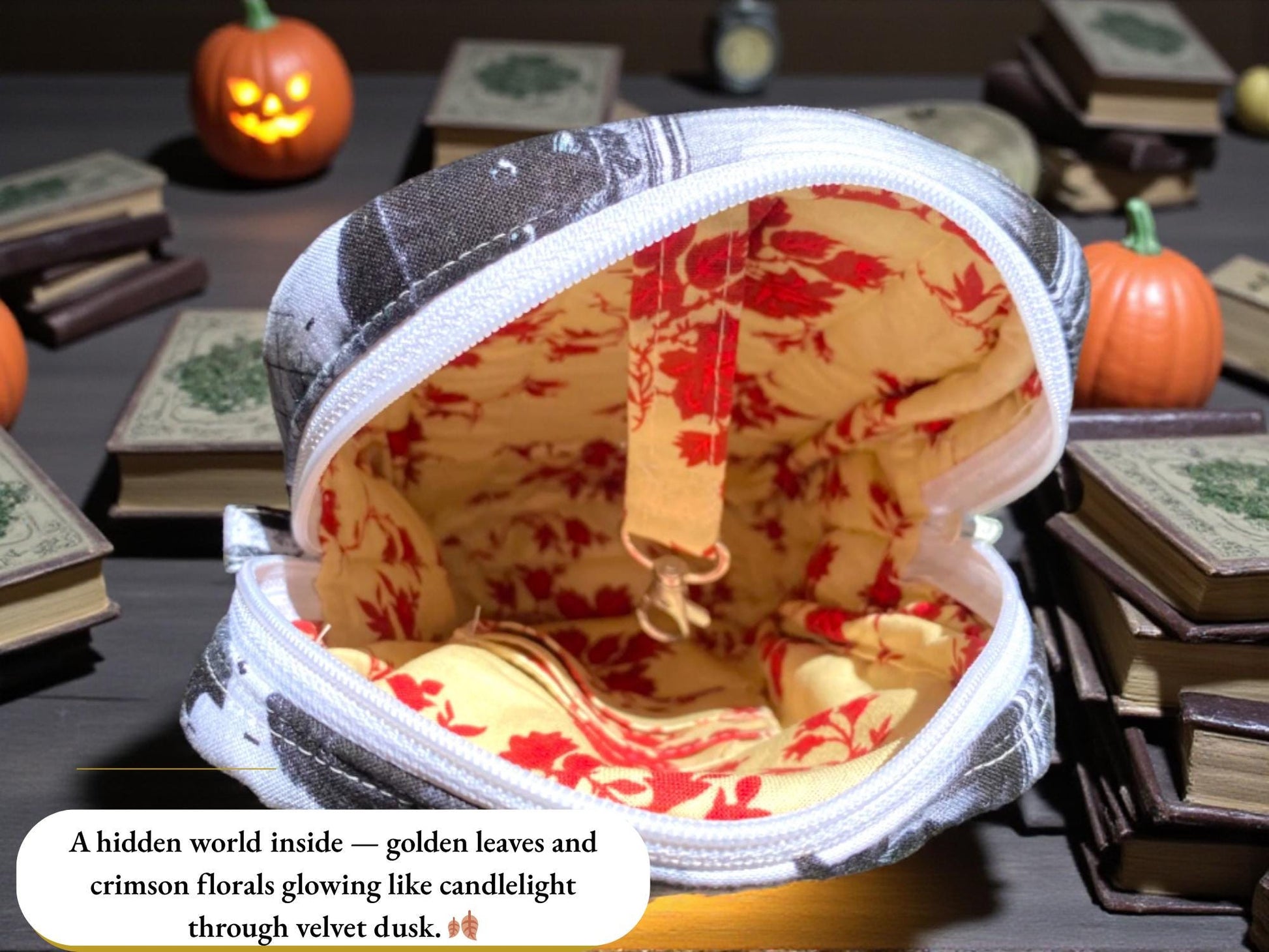 🖤 Lining: Quilted autumn leaf cotton (gold and red tones)