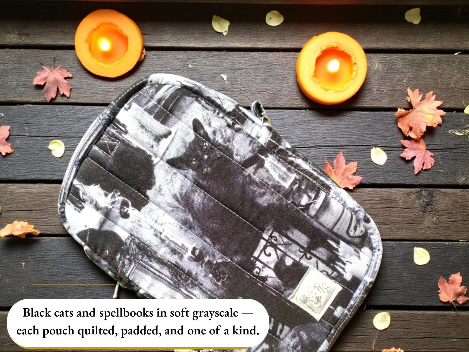 Quilted cotton exterior with black cats, candles, and apothecary-style motifs