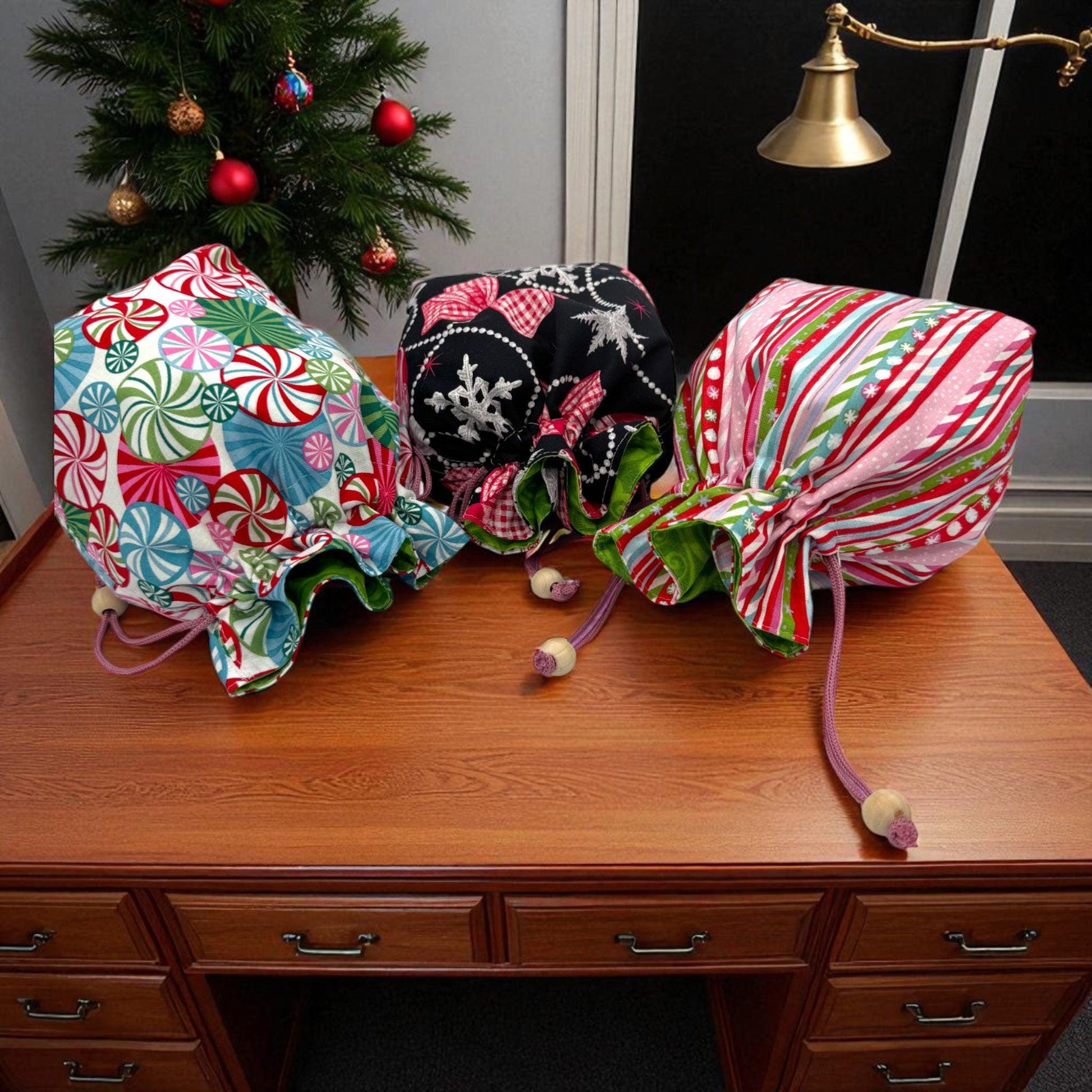 Wrap your gifts in festive charm with this Peppermint Lane (2025) Medium Drawstring Bag Bundle. This trio includes three handcrafted, reusable fabric gift bags in coordinating holiday designs - perfect for wrapping books, candles, small gifts, or handmade items.
