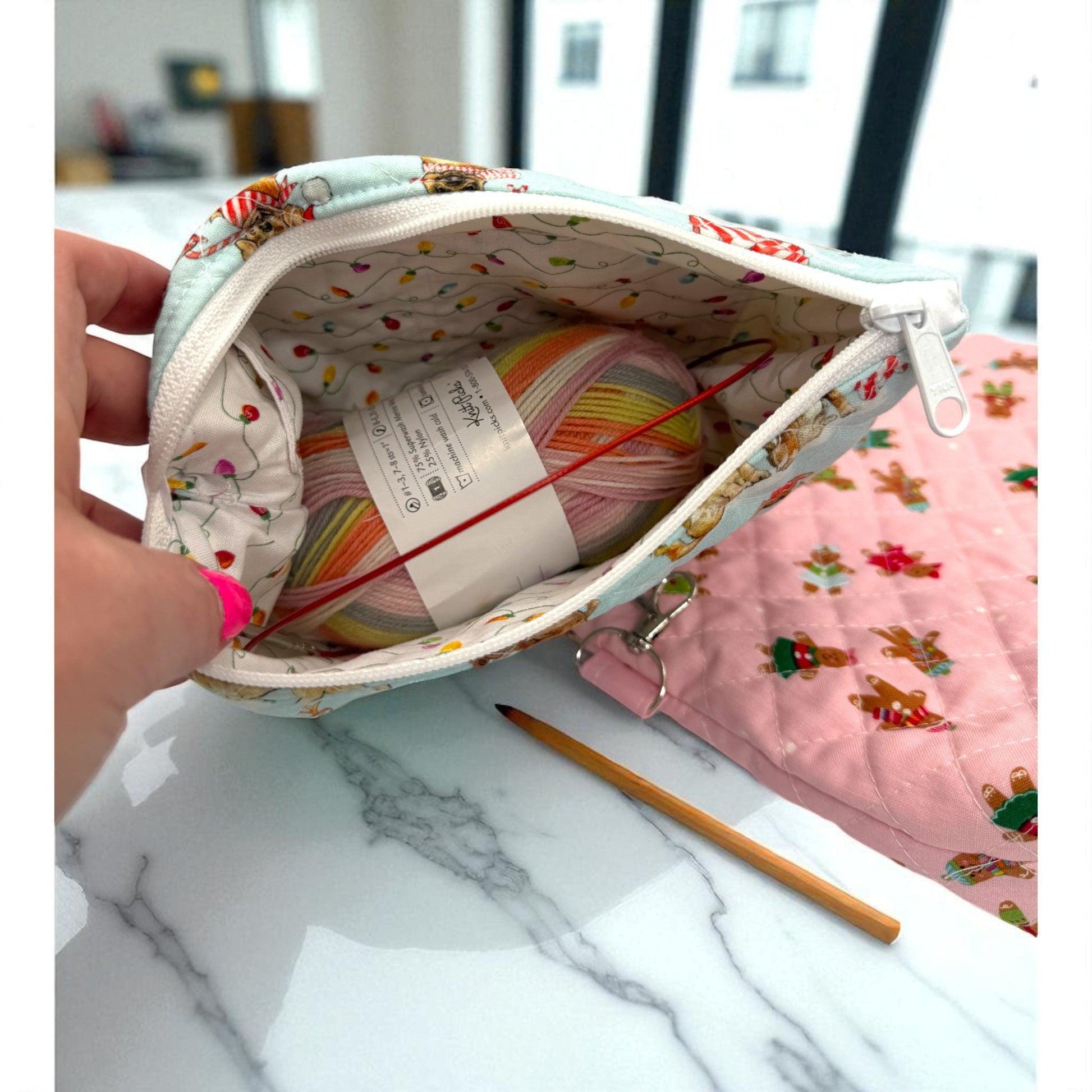 Roomy, festive, and beautifully handmade - this large pink gingerbread pouch is the perfect blend of charm and function. Quilted with care and fully lined, it's ready to hold makeup, craft supplies, travel essentials, or serve as a one-of-a-kind holiday gift bag.