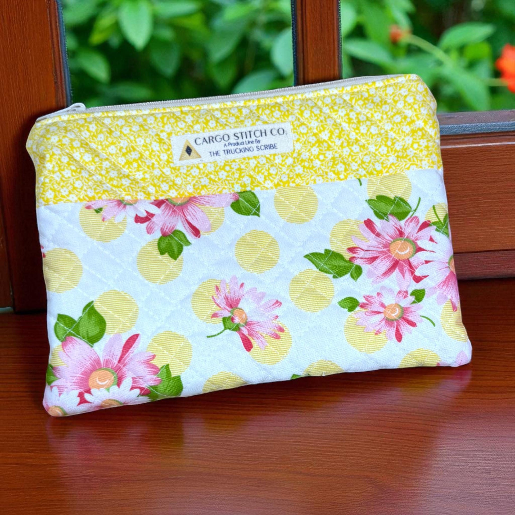 Pink Daisy & Polka Dot Quilted Pouch | Stitcher’s Carry Zipper Bag with Yellow Floral Band | Handmade Project Organizer for Crafters