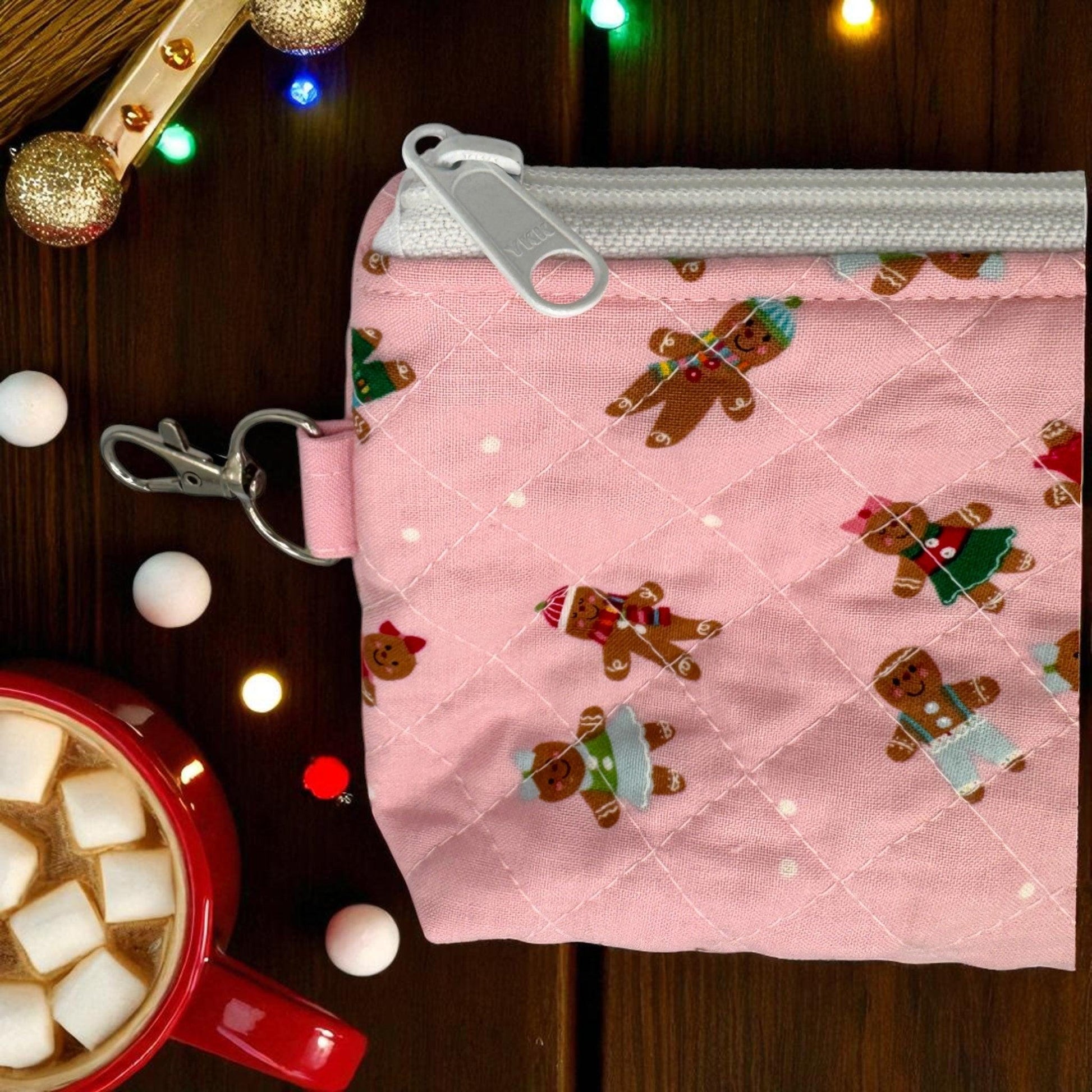 Medium Quilted Zipper Pouch – 7x5x1.5 Pink Gingerbread Bag Handmade Holiday Stocking Stuffer. Cosmetic Pouch