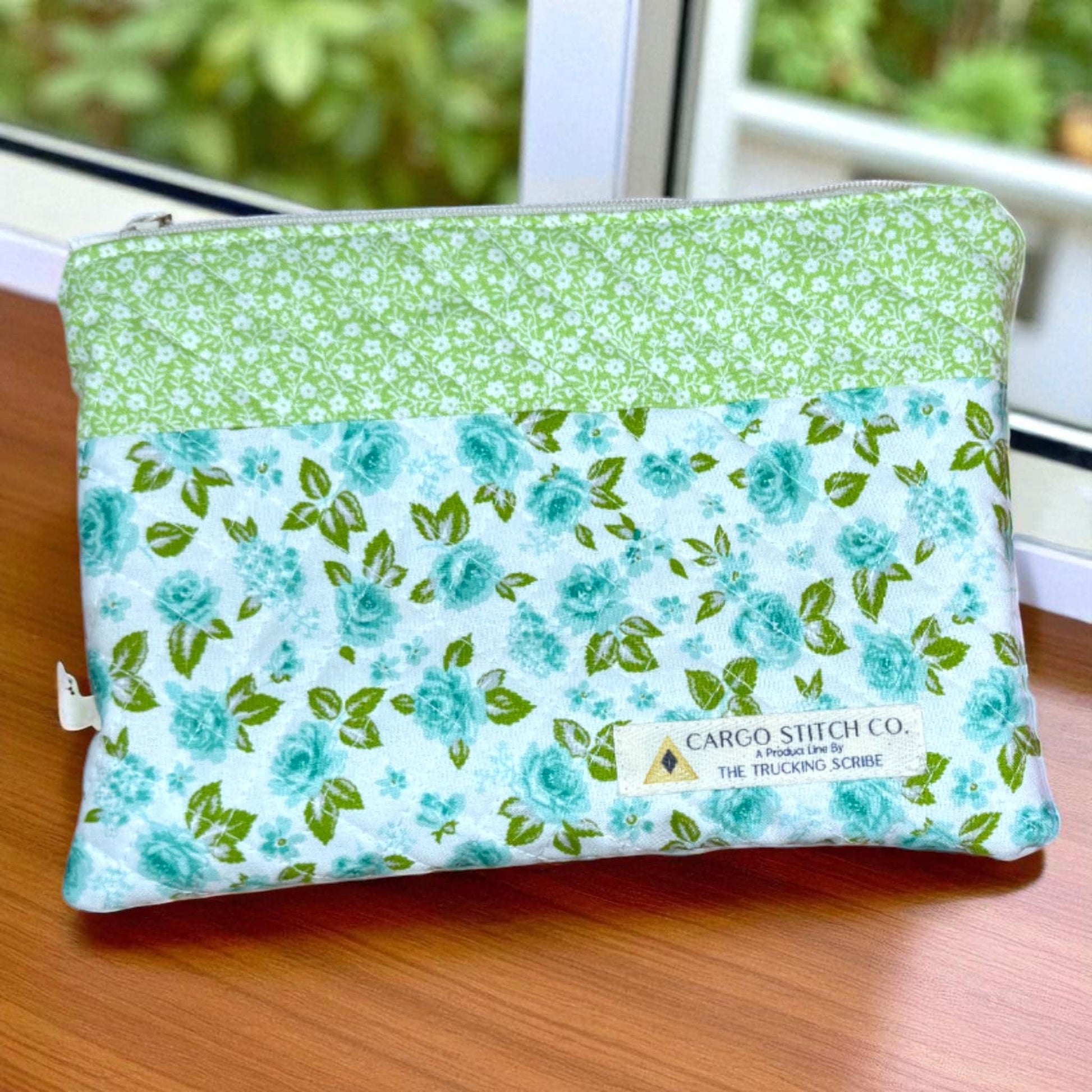 Aqua Rose Quilted Zipper Pouch | Stitcher’s Carry Handmade Bag | Green & Blue Floral Project Organizer for Sewing or Journaling