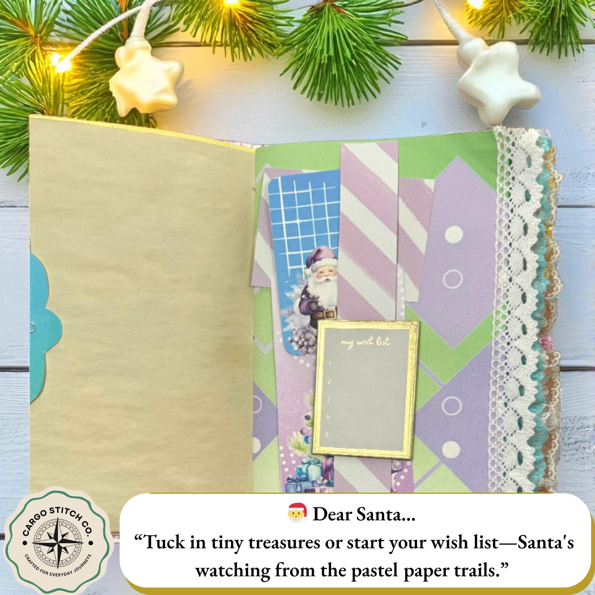 A soft-cover envelope-style journal in peppermint pastels, layered with vintage Christmas artwork, candy stripes, and ephemera pockets-ready for your December memories.