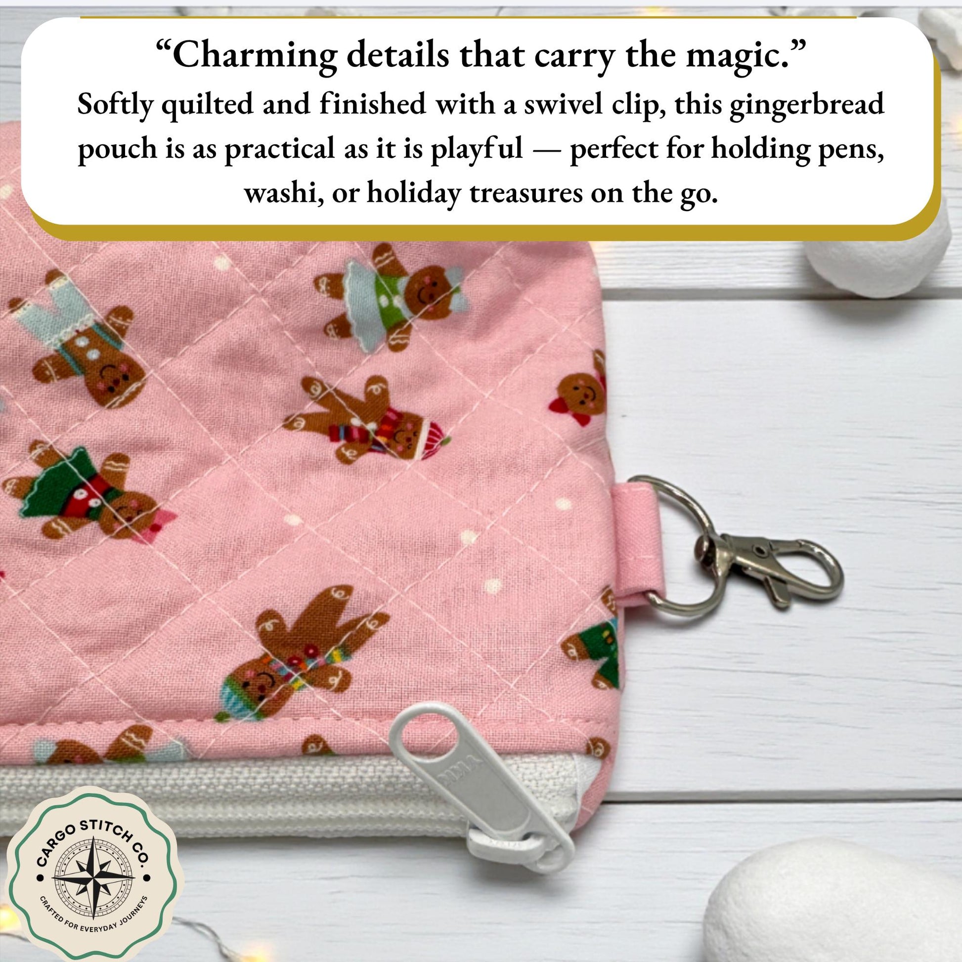 A 7×5" handmade pouch lined and quilted with care, featuring a parade of dancing gingerbread friends. Finished with a swivel clip and Cargo Stitch Co. label.