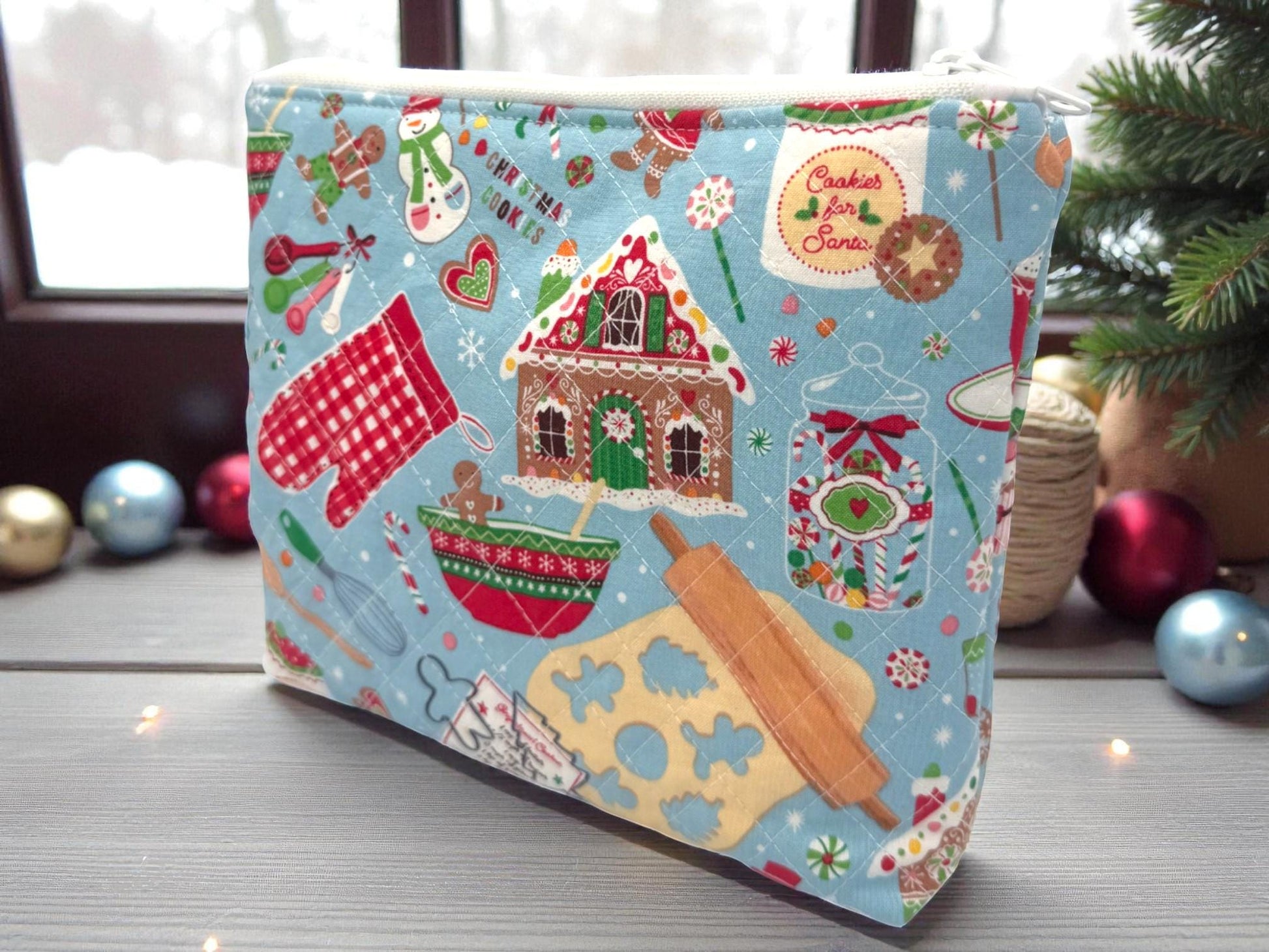 Celebrate the magic of holiday baking with this Christmas Baking Quilted Pouch - where gingerbread houses, cozy mittens, and festive treats come together on soft blue quilted cotton. Featuring snowmen, candy canes, mixing bowls, and handwritten recipe cards, this handmade zipper pouch captures the warmth of Christmas kitchens and cozy traditions. Perfect for makeup, crafting supplies, or holiday gift-giving.