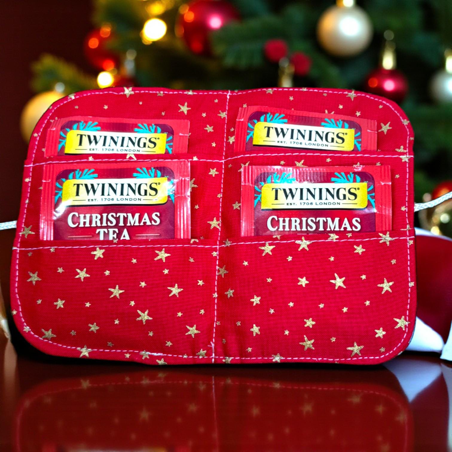 Perfect for tea lovers and travelers alike, this wallet keeps your favorite tea sachets protected and ready wherever the season takes you. Each piece is one-of-a-kind, made from quilted Peppermint Lane patchwork with a gold-star cotton lining and ribbon tie closure.