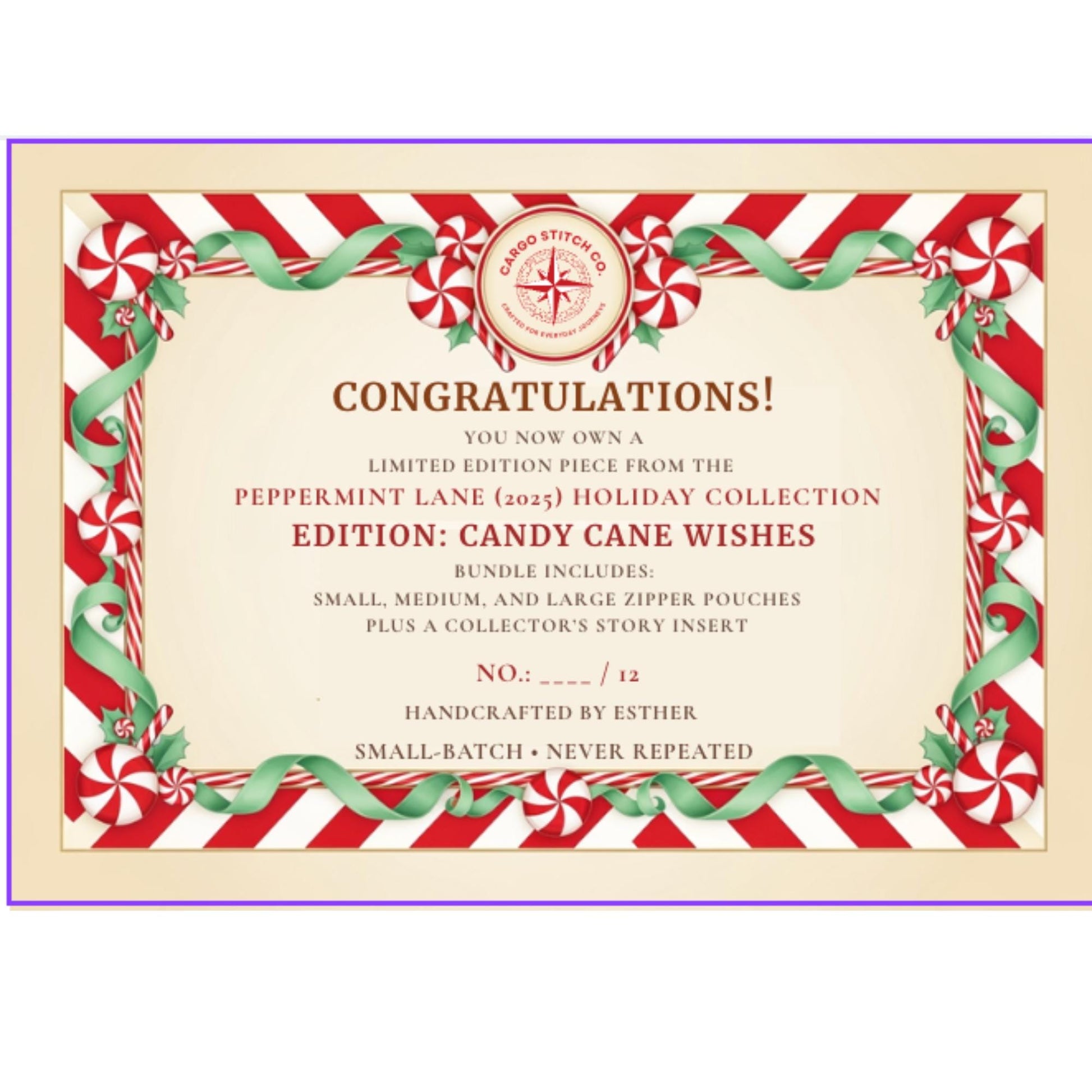 Each piece is numbered, tagged, and signed as part of the Peppermint Lane 2025 Collector's Series.
