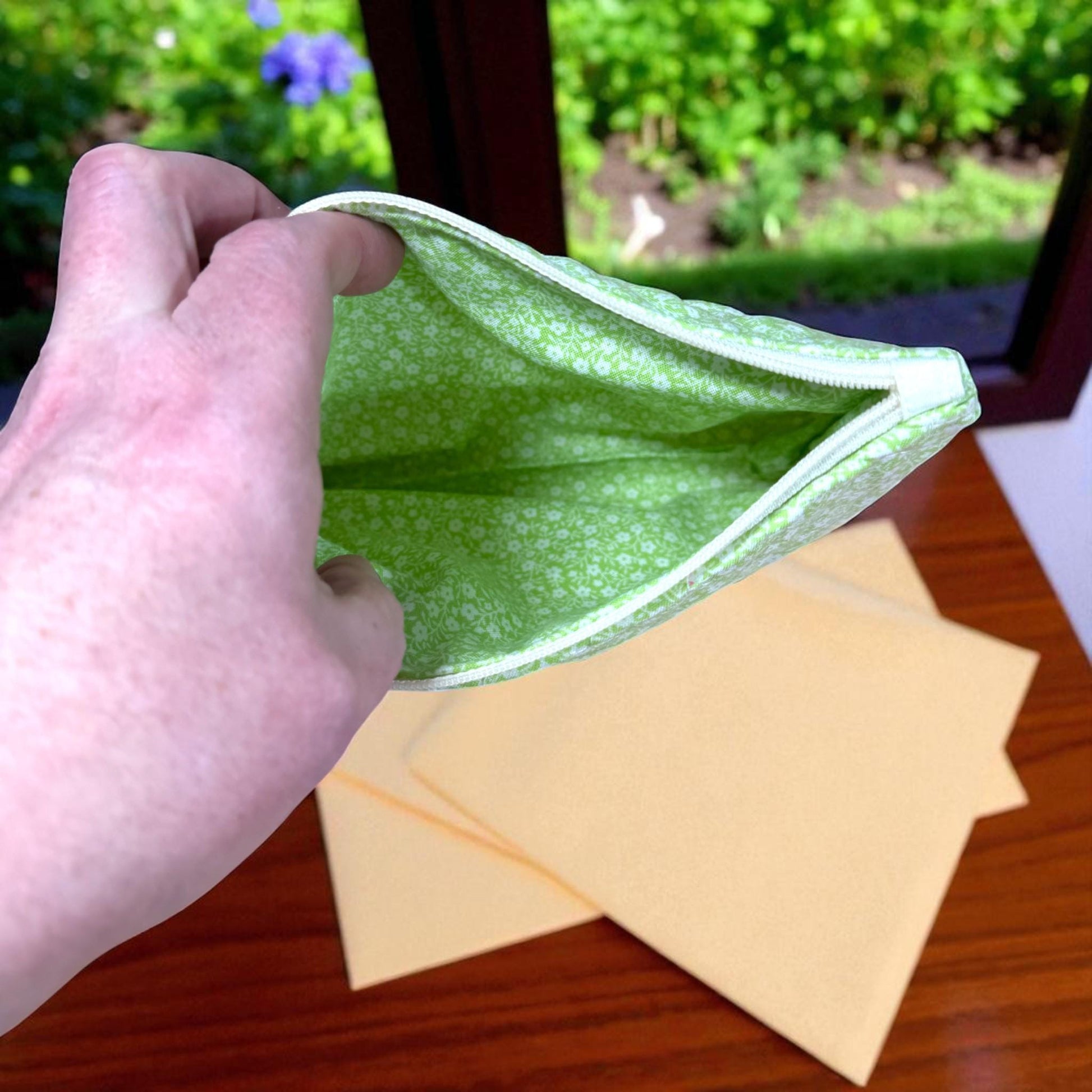 This pouch features a quilted cotton exterior with rose floral and green floral contrast fabric. It is fully lined in coordinating cotton and closes with a white nylon zipper. Fabric placement may vary slightly from the photos. Each pouch is handmade with care in my Georgia studio.